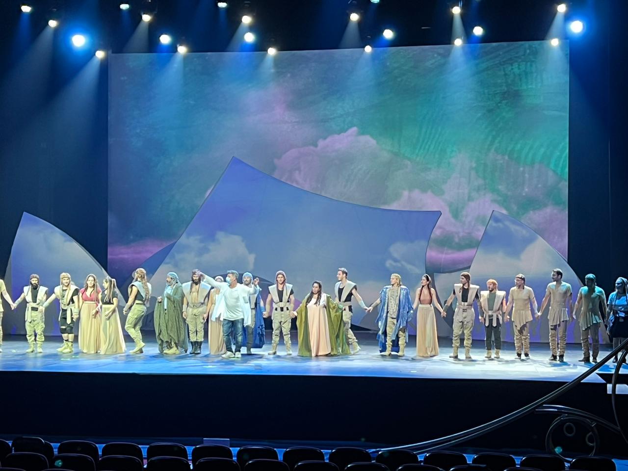 The performance needed to illuminate the Homeric epic with poetic speech and exciting action. The show needed to bring the audience into the long sail of Odysseus and his suffering in the sea when Poseidon breaks up his raft. The scene required sail-like shapes that the producer could project onto. J&C Joel provided its white Joelastic fabric, which ensured a seamless sail shape over a metal platform and a great projection outcome.