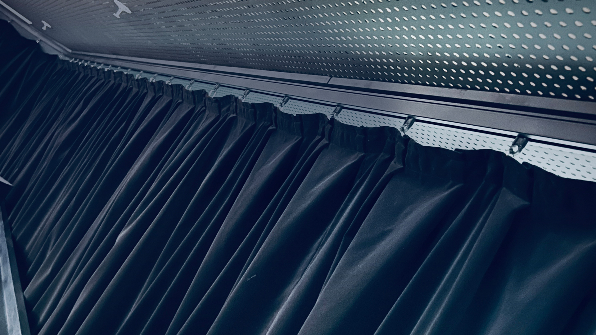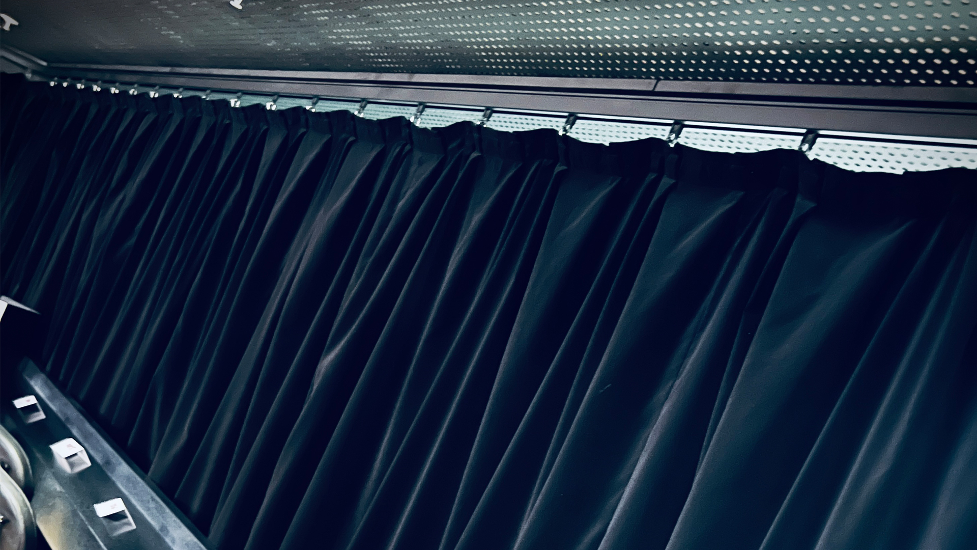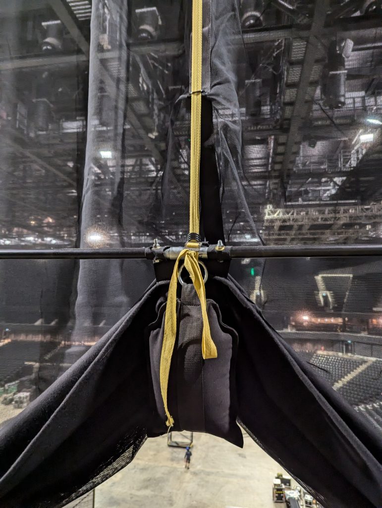 Hung from each Festoon System is J&C Joel’s black IFR Premier Wool Serge (WS090) drapes. The drapes are sewn flat and headed with ties for a secure attachment. On the rear face of the drapes, “D” rings are sewn in line with Kevlar drop lines to guide them through.
