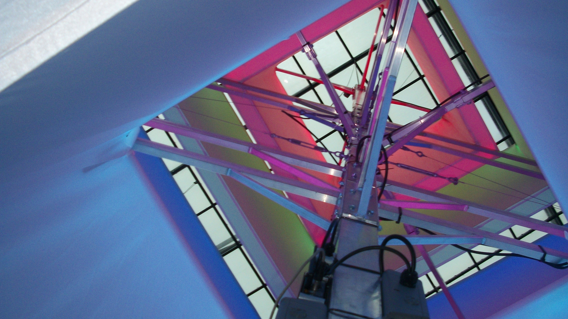 The impressive luminous pendant, based on a design developed by GIA Lighting, comprised of a series of aluminium frames, linked together by braces at the upper frame, assembled in a concentric orientation. Braces link the outer and inner sections to provide stability to the outer perimeter.
