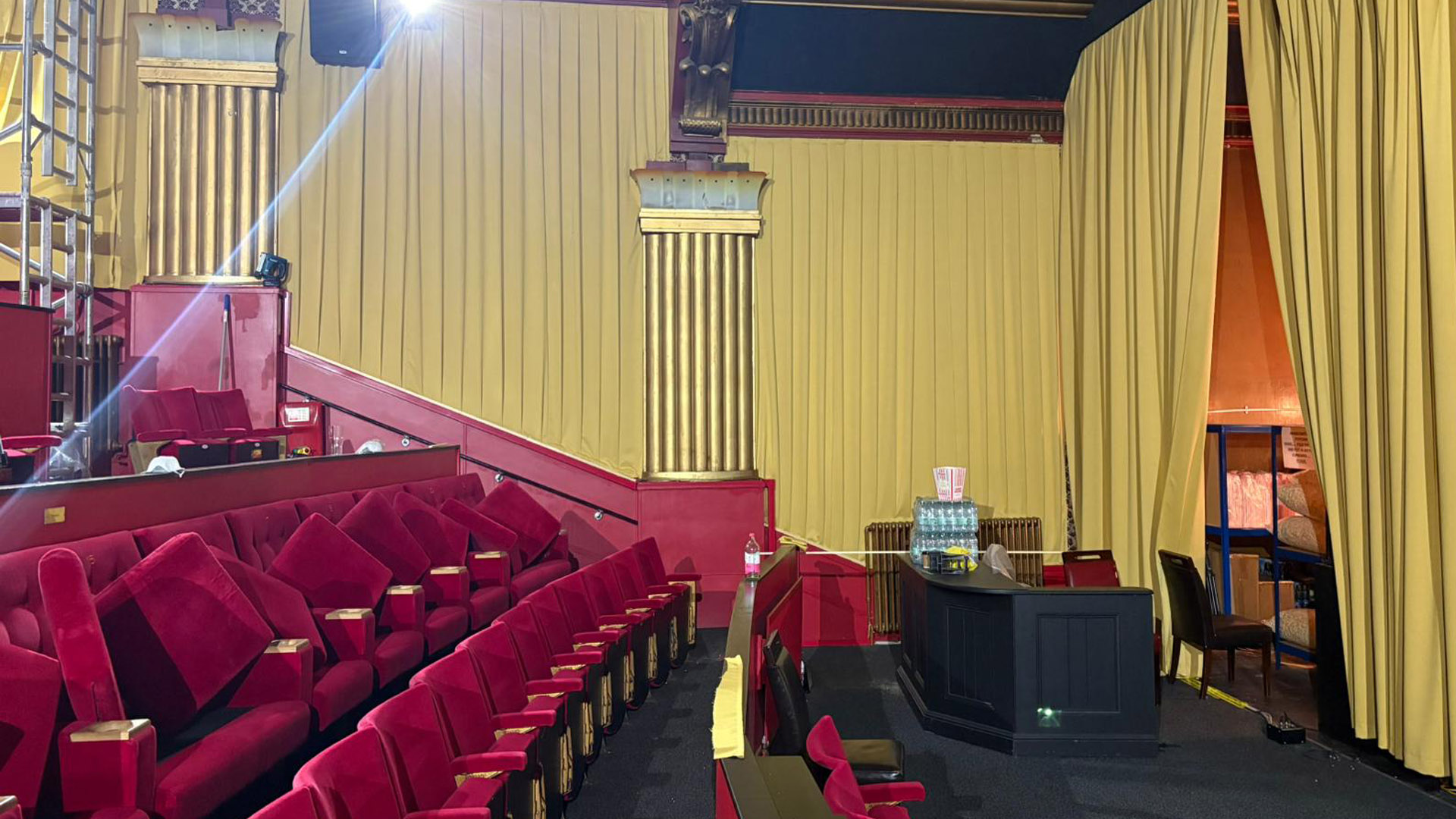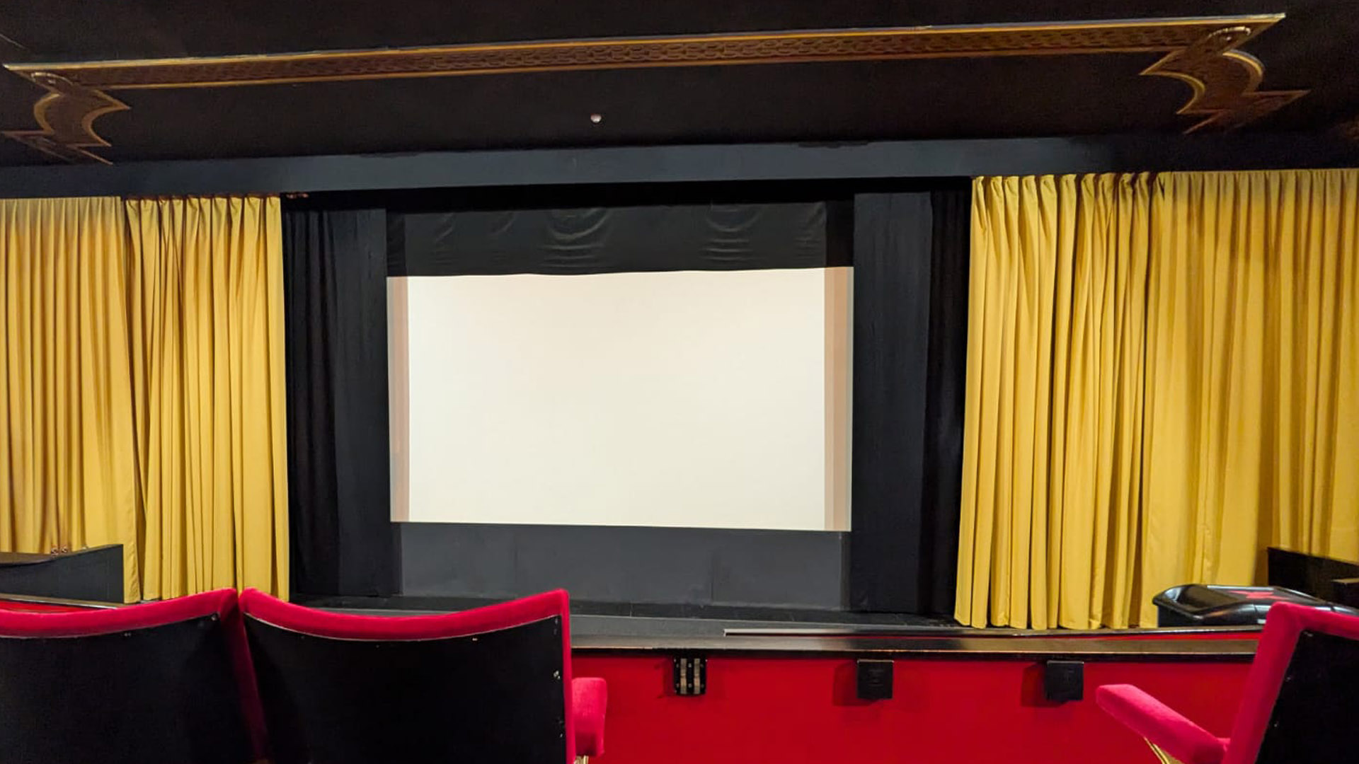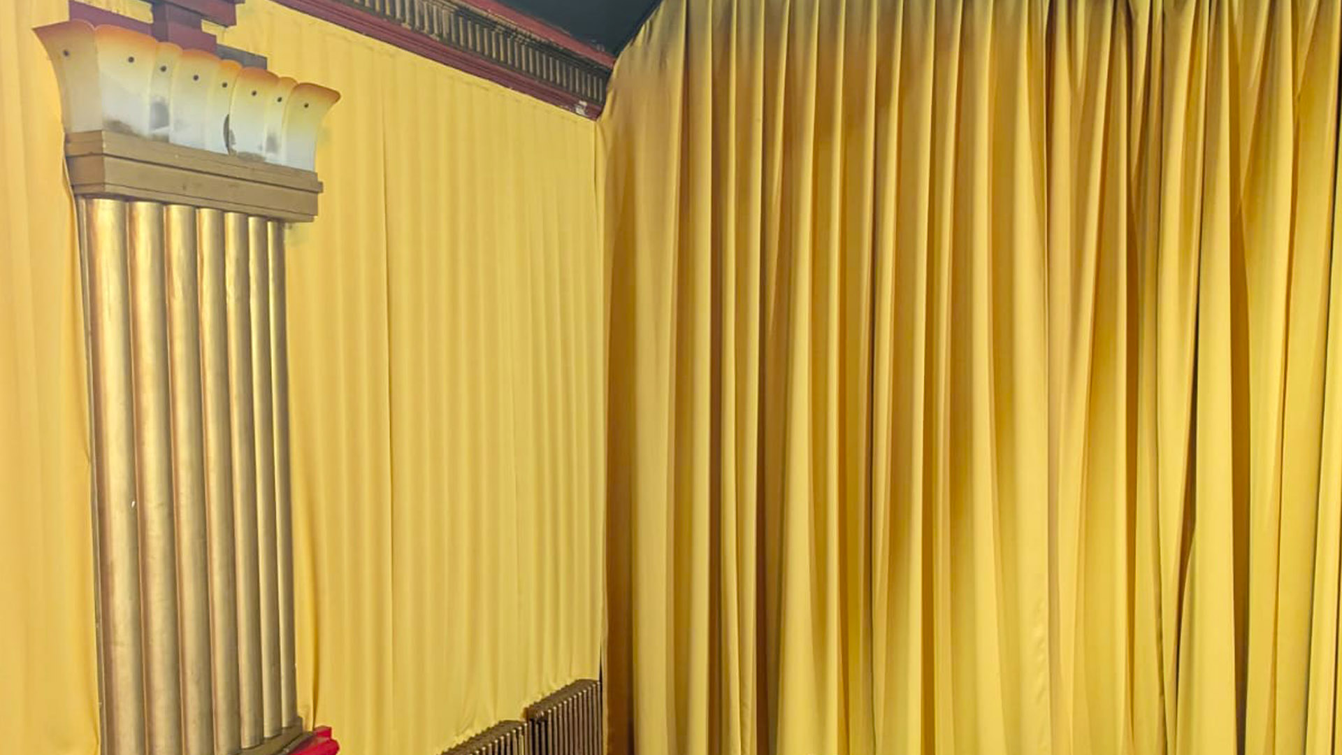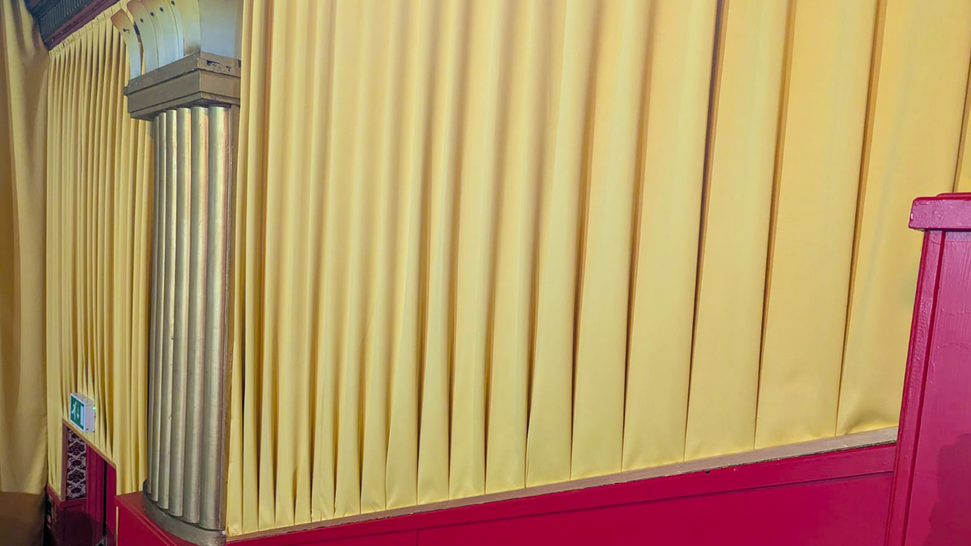 To fulfil the brief, we manufactured and installed 243 meters of Mercury Gold fabric. This material was used to create two new front-of-house drapes, a pair of side legs, and eight bespoke acoustic panels. These were designed to complement the cinema’s interior and enhance both its visual appeal and acoustic performance.