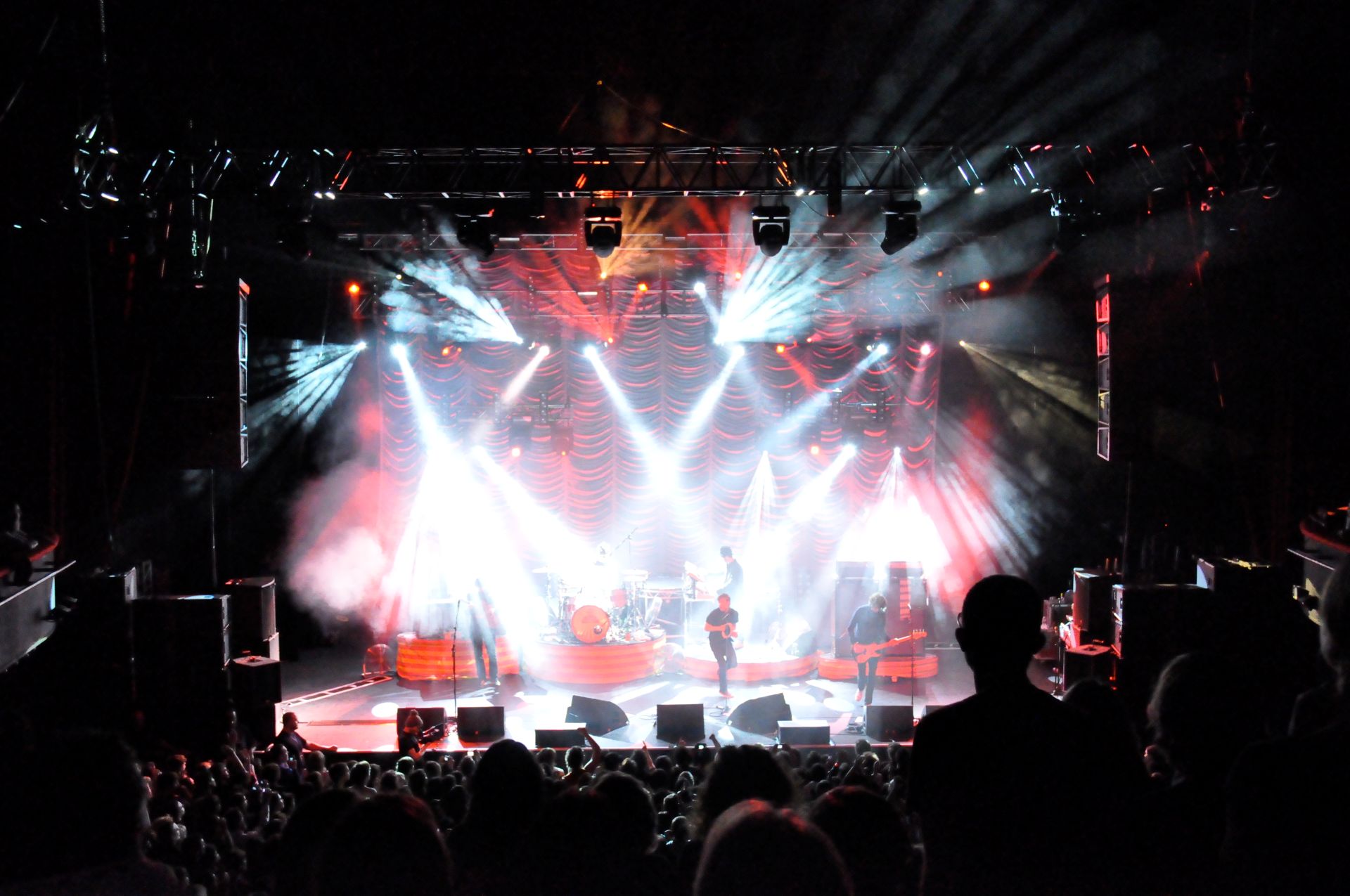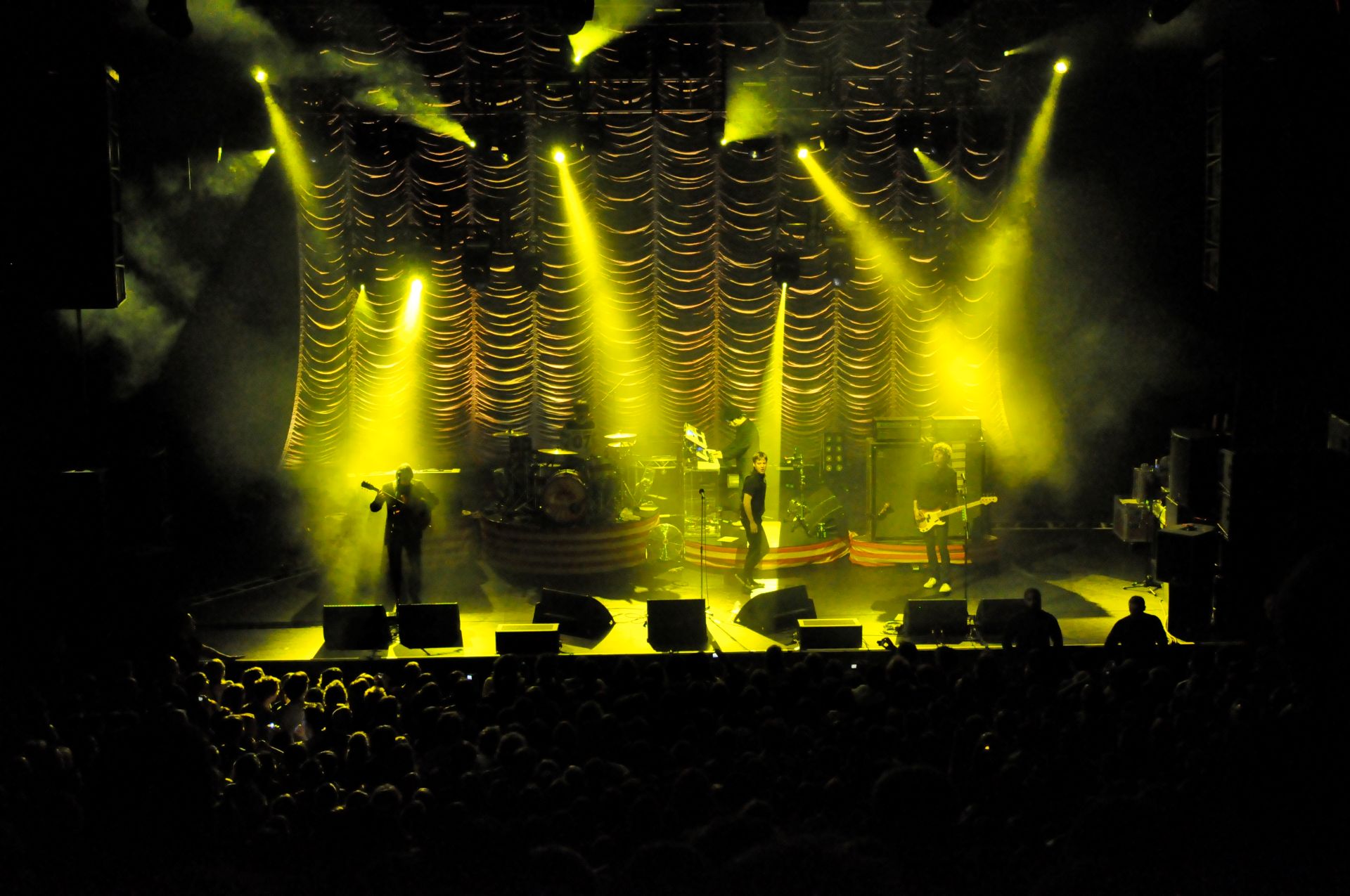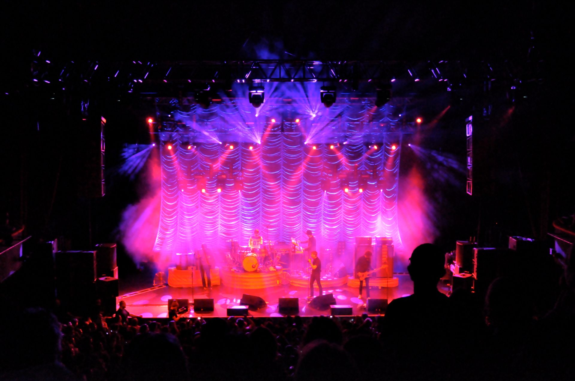 In support of the Kaiser Chiefs’ UK Tour, J&C Joel was commissioned to manufacture a bespoke Austrian curtain. This acted as the backdrop for the stage. Lighting Designer, Richard Larkum, chose the curtain and selected a silver Trevira CS Silk. A fabric that is known for its refined appearance in lighting performances.