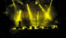 Throughout the tour, the curtain was lit in myriad colours. This allowed the backdrop to be transformed into an imposing waterfall of iridescence cascading towards the stage. It meant that the mood of the backdrop could be instantly altered with lighting. It could be powerful and striking one moment before turning it into a calm yet breath-taking sea of colour the next.