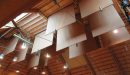 In order to blend the roller banners with their surroundings the mechanisms were inset into the hall’s roof cavity so that all that is visible when the banners are not in use are slits in the ceiling. The acoustic wool serge banners were also custom dyed to match the venue’s timber cladding.