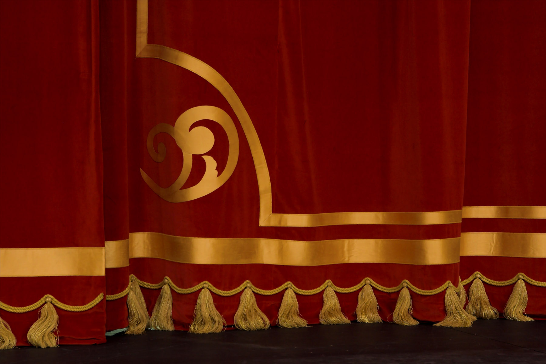 Manufactured from luxurious custom dyed true red Heavy Velvet Velour and adorned with gold tassels and appliqué work, the front of house tabs are befitting of their grand surroundings.